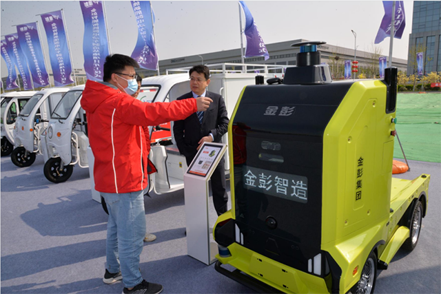 工作人員為與會貴賓講解智能無人駕駛物流車